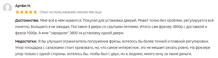 Владельцы отмечают привлекательную цену, надежную конструкцию, простые настройки, удобство в работе. Изготовлен не хуже дорогих брендов. Есть небольшой люфт на направляющих, но он практически незаметен. При фиксации инструмента люфт отсутствует вообще. Хорошая, достойная машина. Есть нарекания на односторонний упор – при некоторых операциях это не совсем удобно, хотя и не мешает выполнять нужные действия.