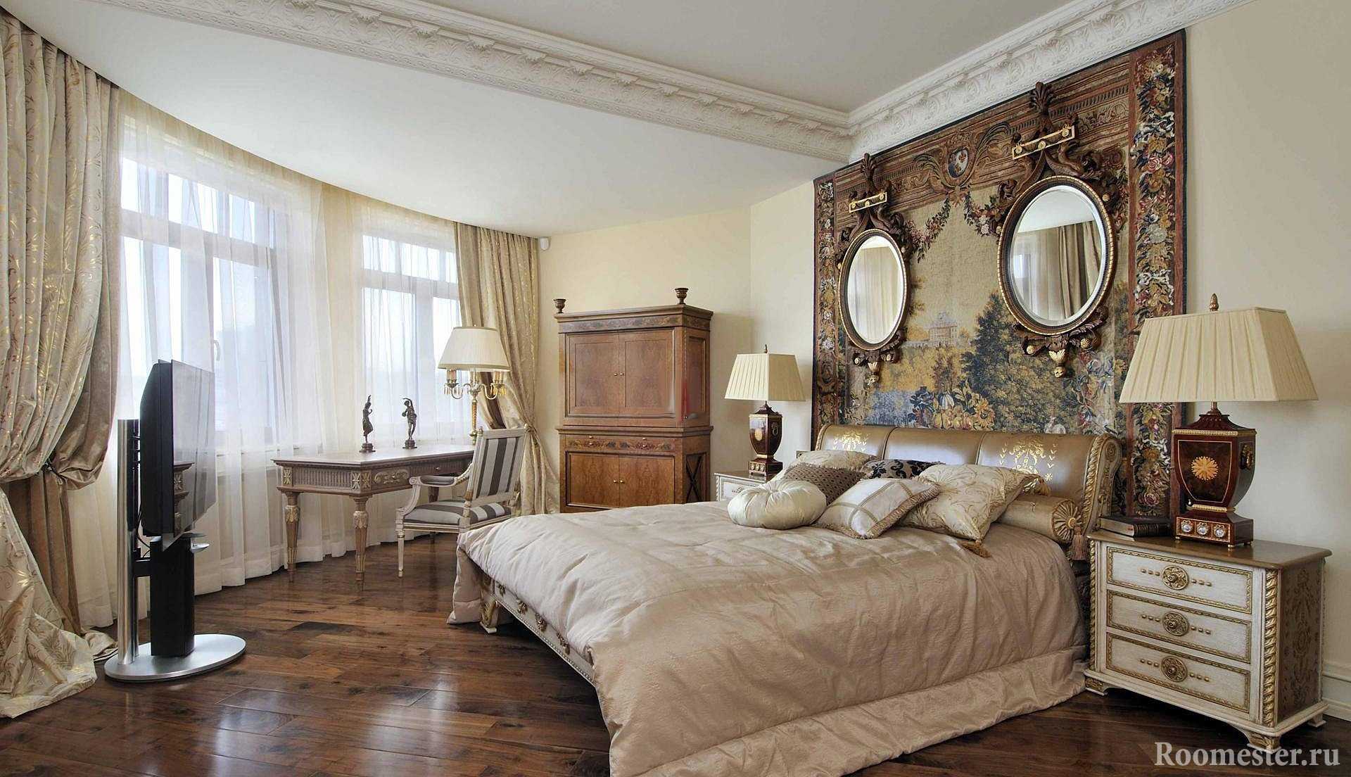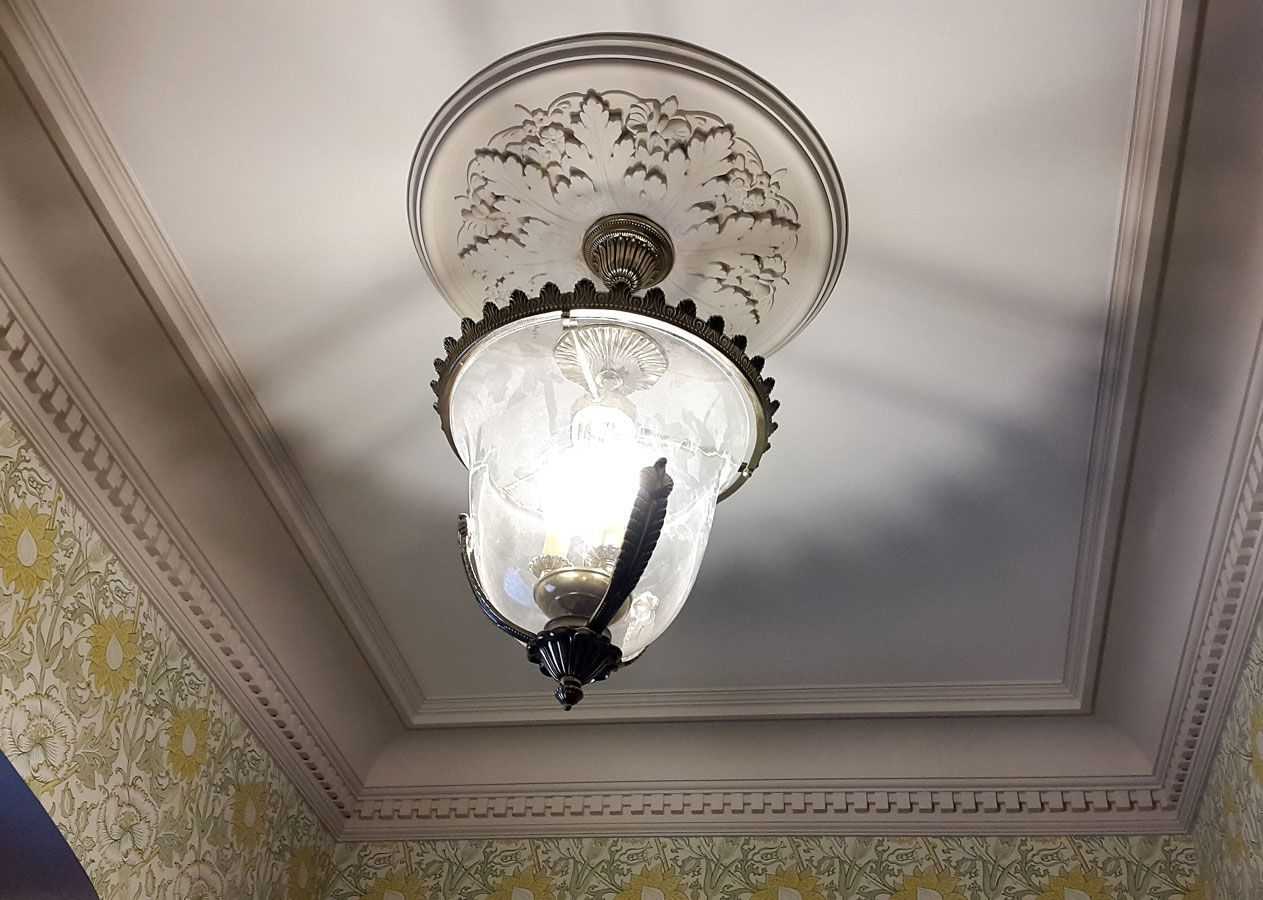 Потолок, выполненный в любом имперском стиле, всегда имеет множество элементов лепнины. Центральная потолочная розетка подчёркивает красоту люстры , несомненно, внесет лепту в общий дизайн комнаты.