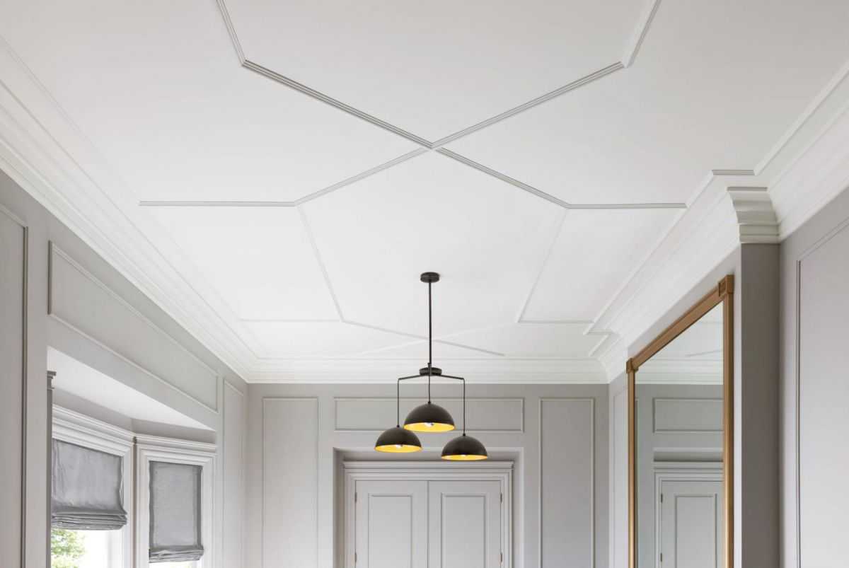 Накладными деталями в виде узких выпуклых планок успешно выполняют зонирование помещения. Часто молдинги используют для обрамления периметра потолка или создания несложных геометрических узоров. Другое назначение — маскировка места соединения материалов, например, отделки разного цвета.