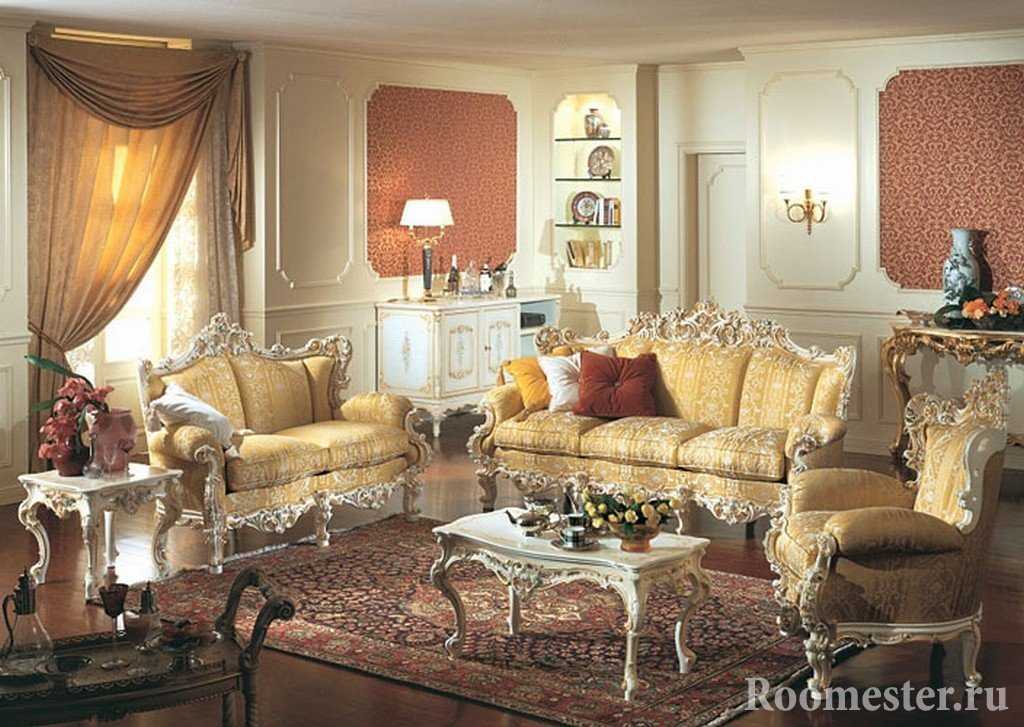 Стиль уделяет огромное внимание декору: колоны, карнизы, орнамент, роспись стен, потолка. Используется массивная мебель из темного или светлого дерева
