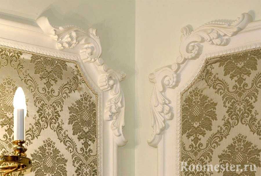 Такие изделия обычно идут в комплекте с карнизами и молдингами, повторяя узор и ширину основного элемента. Угловые фрагменты позволяют красиво оформить поворот, а также придают композициям большую декоративность и выразительность. Часто угол дополняют фестонами — полукруглыми гирляндами с плетеным орнаментом.