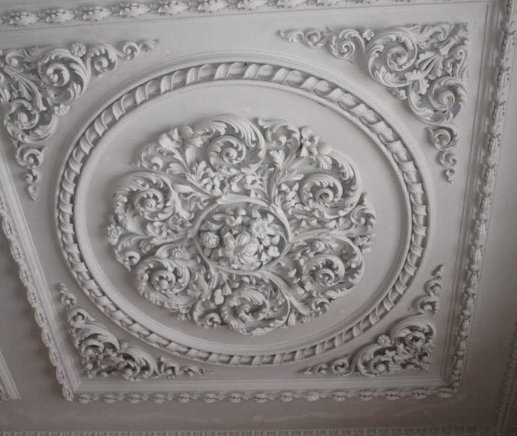 Традиционно лепнину на потолке делают из гипса. Сложные лепные элементы отливают с помощью форм и после застывания крепят к поверхности. Более простые детали можно выполнить по месту с помощью шаблона. Работа эта довольно кропотливая и требует высокого мастерства отделочников, потому и стоит недешево.