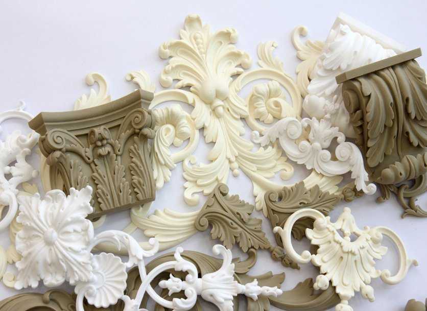 Лепные декоративные украшения делали не только путем литья из гипса. Их вырезали из массива дерева, вылепливали из древесной пасты, смешанной с гипсом. Известны варианты из бетона, керамики, из гипсокартона и из полистирола.