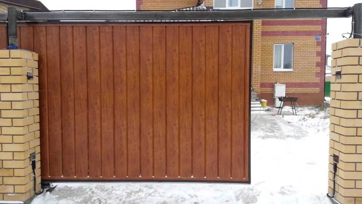 Профнастил. Этот материал очень лёгкий и прекрасно крепиться за счёт саморезов к конструкции откатных ворот. Его покрытие способно сохранять исходный вид несколько десятилетий. Так же вы можете подобрать листы настила в зависимости от ваших целей.