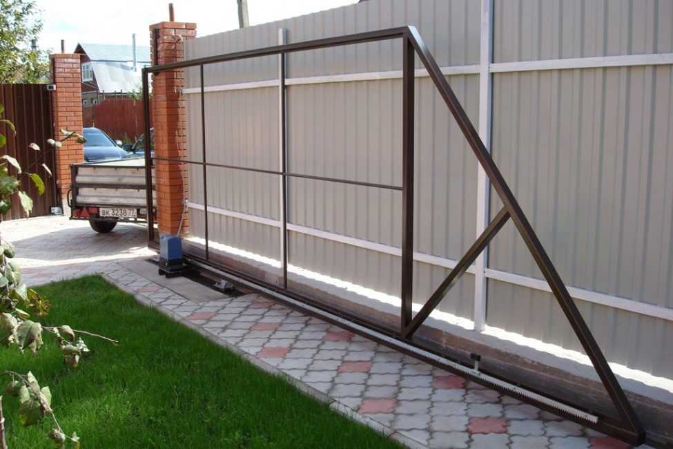 Непосредственно створка ворот крепится к металлическому каркасу, который представляет собой раму, изготовленную либо из металлопрофиля, либо из стальной трубы. К металлическому каркасу приваривается направляющая. Зачастую она представлена в качестве зубчатой рейки, особенно это касается конструкций с электроприводом. Внутрь направляющей балки вмонтировано роликовое основание. Как правило, в консольной системе под роликовым основанием имеются в виду каретки на колесиках.