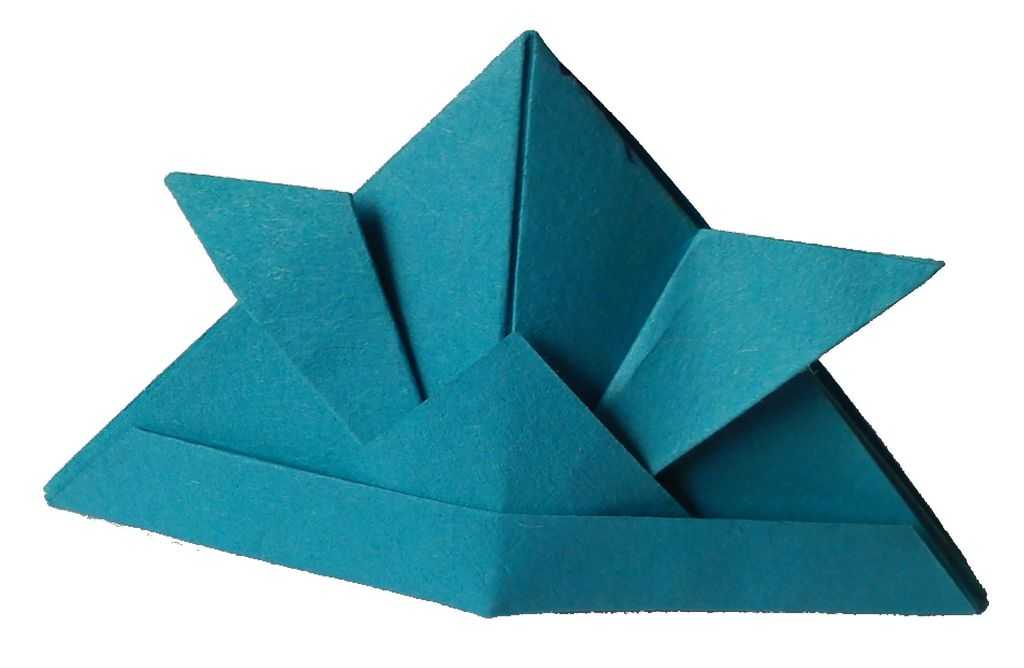 - Японская шапка из бумаги практически готова. Отогните нижний угол верхней плоскости кверху, слегка нахлестывая его на изгибы заготовки, еще раз подверните низ, фиксируя форму;