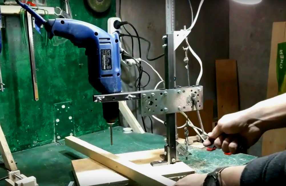 ФОТО: YouTube.comКрепите дрель к плечу стойки скобой и включаете её в сеть, фиксируя кнопку. Потом просто управляете механизмом подъёма, подкладывая нужные детали