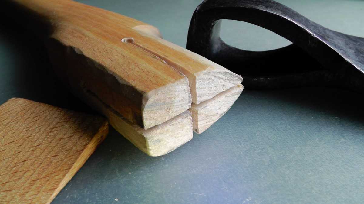 Затем на клей в пропилы устанавливаются 3 клина: один большой продольный и два клинышка по бокам. Вставив клинья, торец топорища следует обработать, чтобы придать ему идеальную ровность.