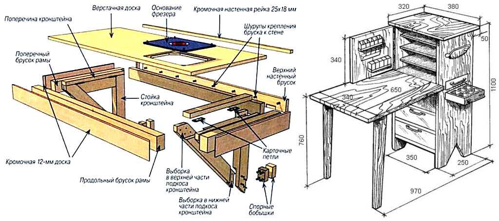 Другой вариант гаражного верстака уже на пристенный, а настенный, слева на рис. Монтировать его можно только на каменные стены. Верстачная доска откидная 2-слойная; каждый слой из фанеры 10-12 мм. Проем под станок со ступенчатой внутренней кромкой. Под «фрезером» в данном случае понимается сверлильный мини-станок с подвижно-поворотным столиком и зажимом для детали. Конструкция удобна тем, что стружка сыплется сразу на пол.
