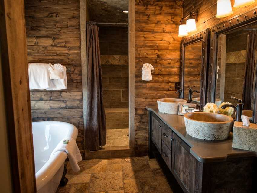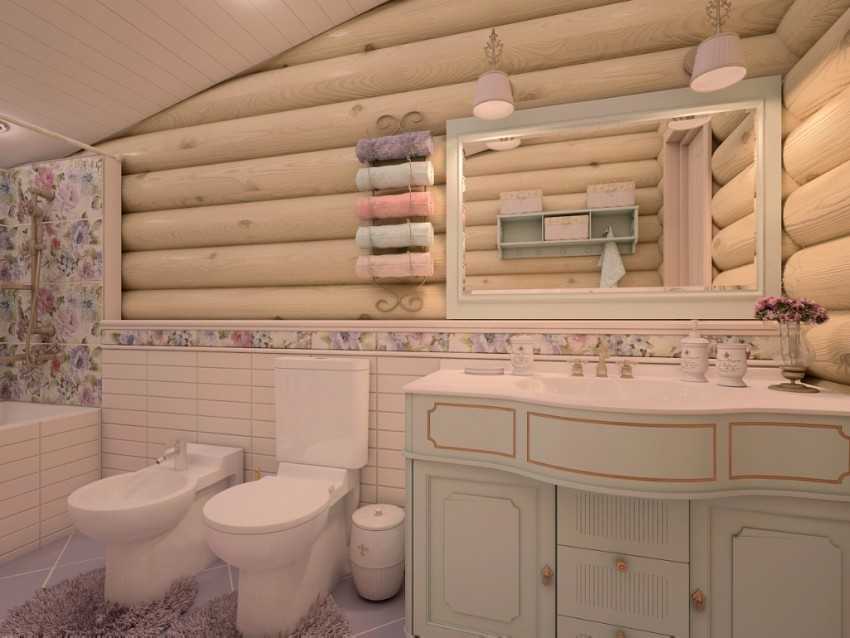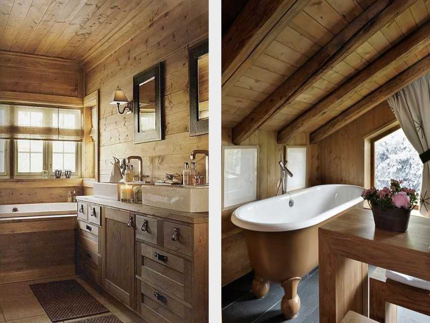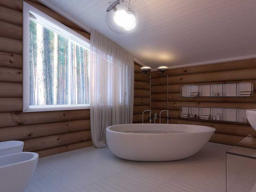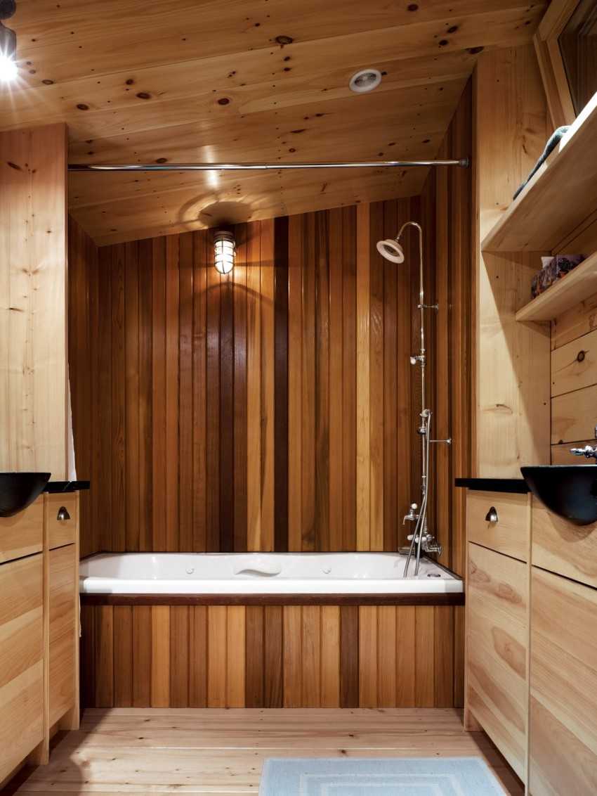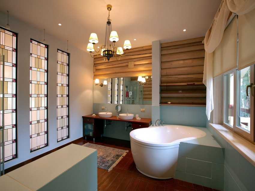 При отделке ванной комнаты в деревянном доме необходимо учитывать отличия такого жилья от квартиры. Главное отличие коттеджа — эко материалы, в частности дерево. Его не стоит закрывать влагостойкими материалами, иначе в ванной может появиться грибок.