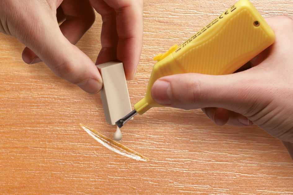 Использование плавящейся шпатлевки более трудоемко, но оно позволяет восстановить ламинат при значительных повреждениях. Недостаток этого способа заключается в ограниченном выборе цветов шпатлевки (гамма значительно меньше, чем у мелков и паст).