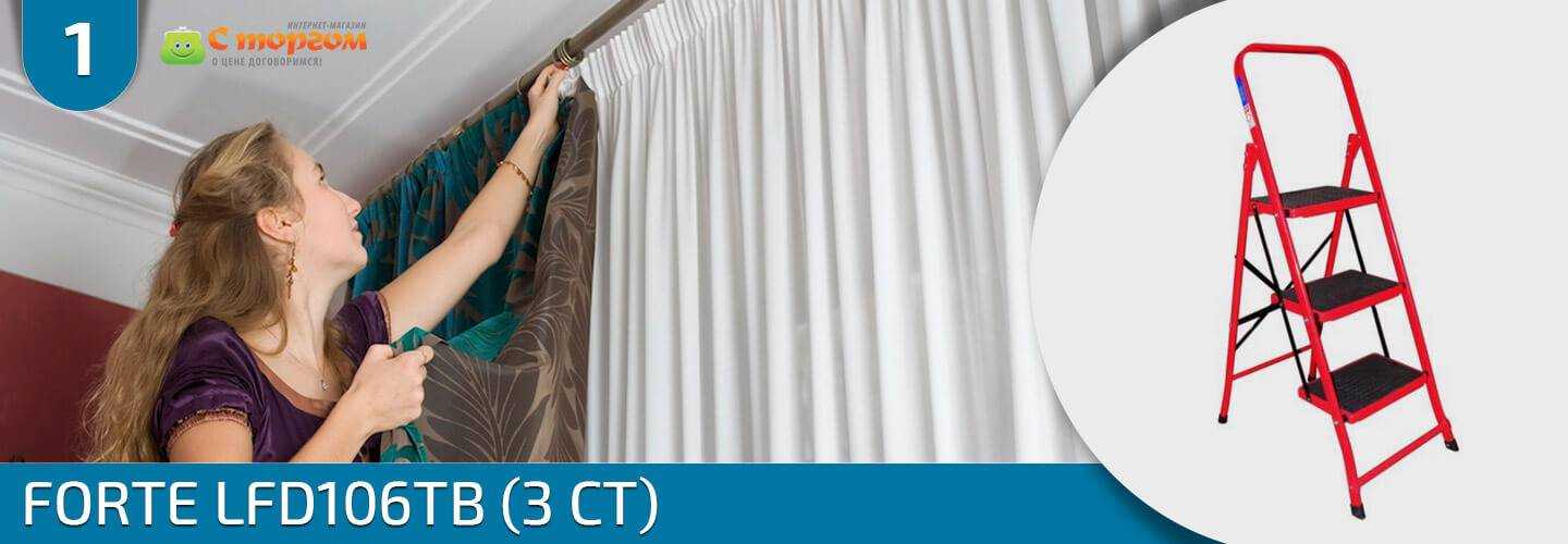 Яркий металлический трап от популярного китайского бренда Форте без проблем впишется в интерьер вашей комнаты. Сделан добротно, не скользит, не шатается. Профиль – металл, покрытый антикоррозийной краской. Ступеньки исполнены в виде широких платформ. На таком сооружении удобно доставать вещи из высокого шкафа, вешать шторы, монтировать полочки. В невысоких квартирах (2,5 м) легко достать и до потолка. Производитель много внимания уделил безопасности: есть и резиновые наконечники, и профилированное покрытие, и удерживающие разложенную конструкцию распорки (продольные и поперечные). В сложенном виде не занимает много места.
