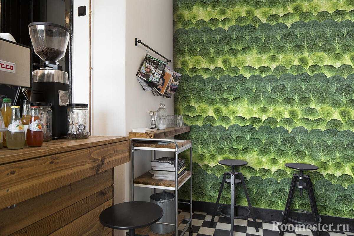 На кухне обои должны сочетаться с отделкой, которая используется на рабочей стенке. Очень удачно смотрится симметричное зонирование, когда стены кухни оклеивают широкими полосами и дополняют ярким принтом на самой заметной открытой стене.
