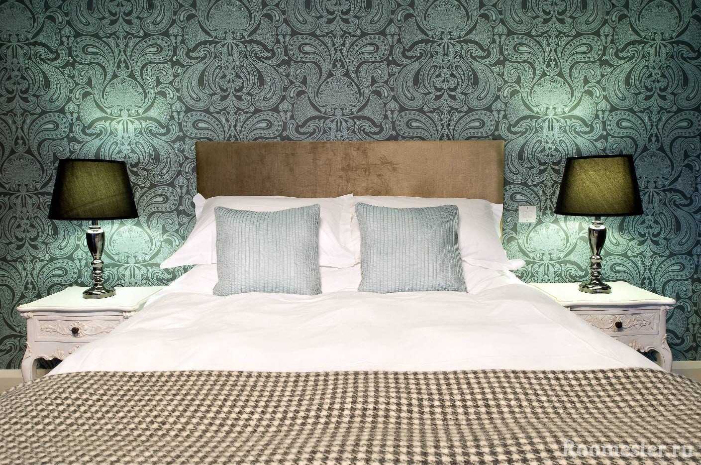Спальня должна быть спокойной и уютной, поэтому предпочтение стоит отдать нейтральным обоям. Зону кровати можно удачно выделить обоими, которые могут заходить на потолок. Из остатков этих боев на противоположной стене можно сделать панно или использовать их для оклейки ниши.