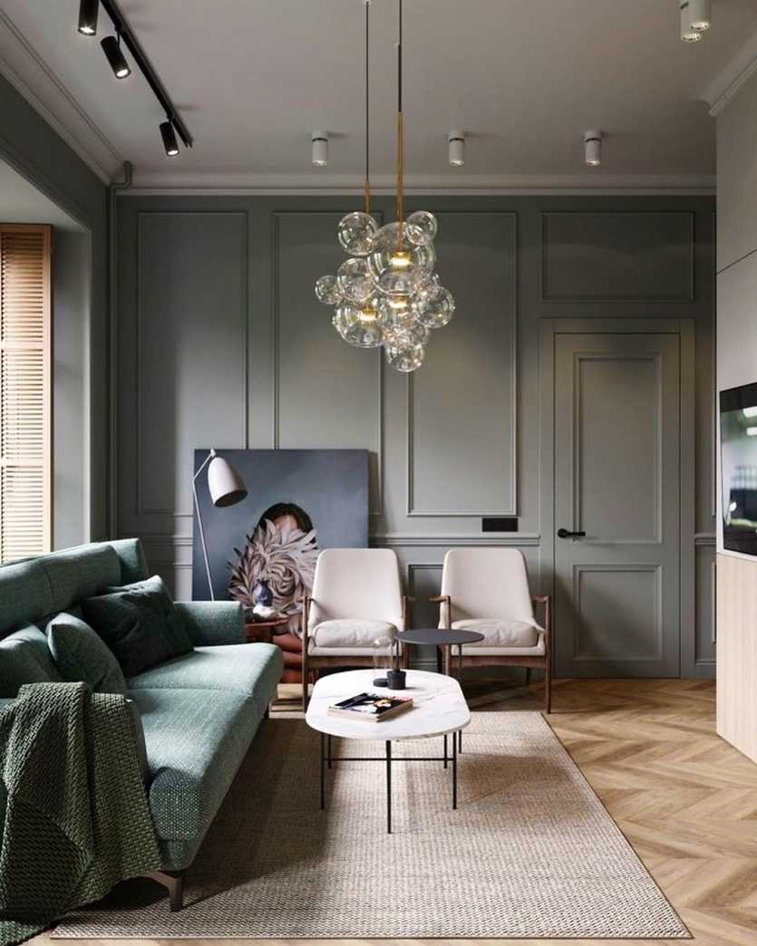 В центре гостиной, где будут проходить семейные вечера и приятные встречи с друзьями, можно повесить лаконичную люстру или сосредоточить несколько крупных светильников. Не забывайте сделать точечный свет по периметру комнаты. Это позволит зрительно увеличить объём помещения и сделать его более просторным.