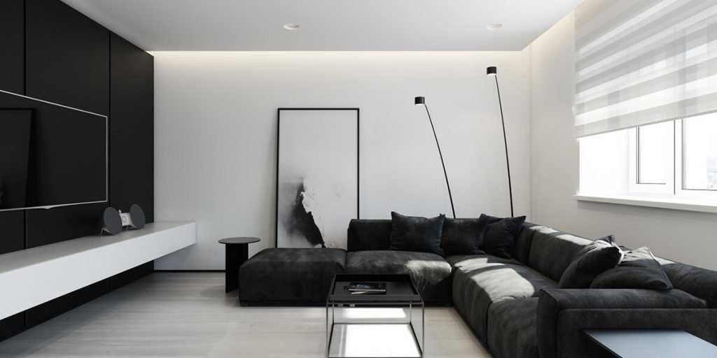 Отличительной чертой такого дизайна является свобода передвижения. Мягкая мебель для гостиной минимализм сдержанная и приземистая. Она представлена удобными диванами прямоугольной формы со спинками и обтянутыми подлокотниками без лишнего декора. Из украшений допускаются только строгие подушки. В тон диванам используются невысокие кресла и квадратные пуфы. Чем более ровные и гладкие поверхности используются, тем лучше. Обивка изготавливается кожаная или текстильная. Цвет диванов — монохромный контрастный или подбирается в тон стенам и полу.