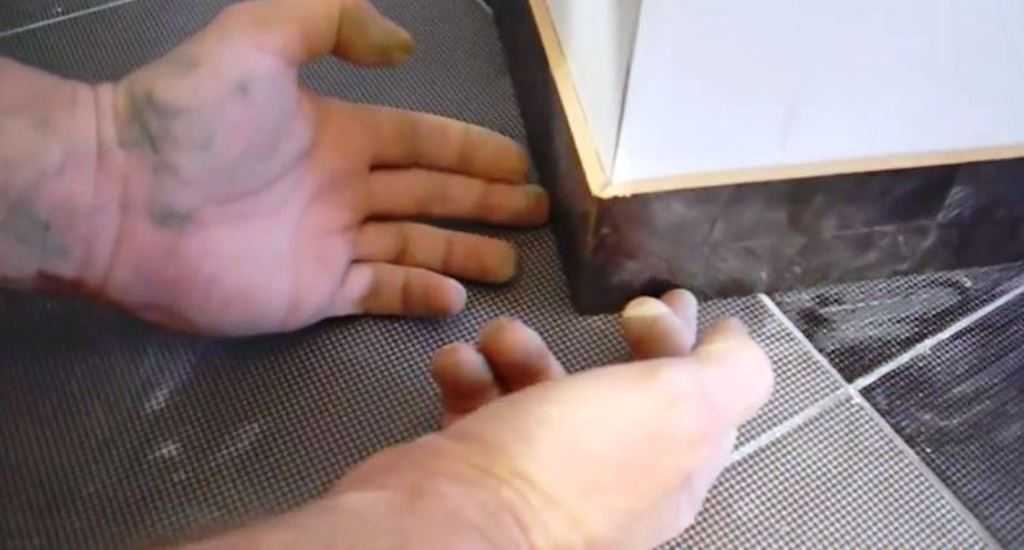 Отметив толщину двух плиток (поочередно) и приставив их к углу нужно провести линию на обратной стороне. Правильность среза будет проверяться по этой линии (расстояние от торца должно быть равным толщине).
