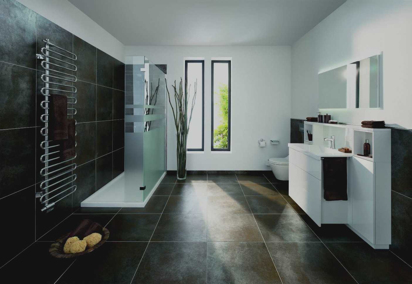 Если внимательно посмотреть, то в красивых дизайнерских проектах ванных комнат плинтус смонтирован и на полу, выступая в роли декоративной панели. Для данного вида характерными материалами служат акрил, мрамор или также самоклеющаяся лента.