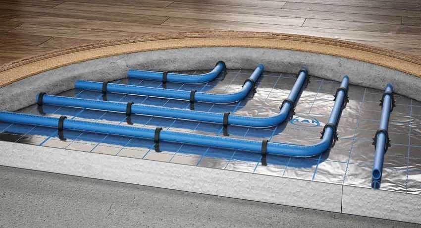 Представляет собой систему трубопроводов, спрятанных под цементной стяжкой, по которым циркулирует горячая вода. Из всех разновидностей теплых полов — эта самая экономичная и дешевая. Однако, установка требует проведения ряда сложных и грязных работ по демонтажу старого пола и укладке нового.