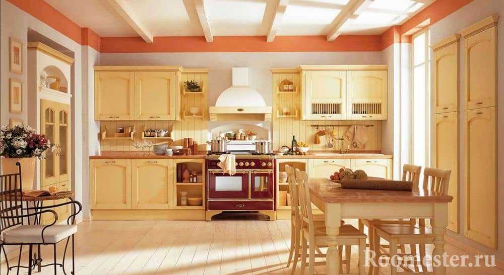 Яркая цветовая палитра. Для большого отрезка времени характерно использование насыщенных тонов. Поэтому при выборе цвета стен или гарнитура для кухни в ретро стиле, имеет смысл остановится на броских, необычных тонах.