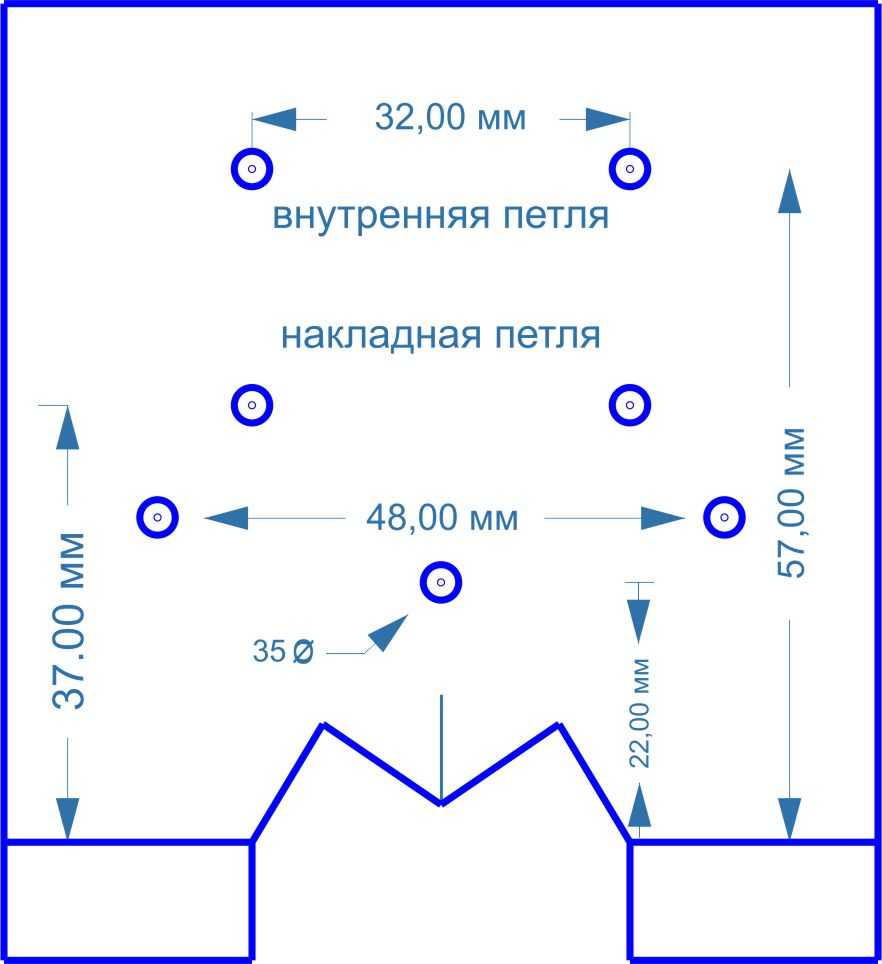 В основном же и массово используются петли с чашей диаметром 35мм. Разметка для фасада