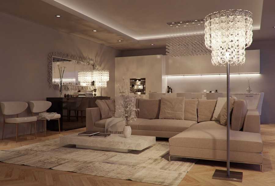 Ближе к окну, в районе осветительных приборов он будет выглядеть мягче, светлее, в дальней стороне – уютнее, выразительнее.