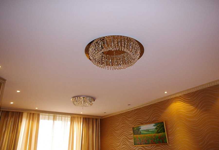 - Если вы решили устанавливать покрытие с узором или рисунком, выберите подходящие осветительные приборы. С разноцветными полотнами удачнее всего сочетаются люстры. Точечное освещение в данном случае будет удачно смотреться по бокам на гипсокартоне (при условии комбинации).
