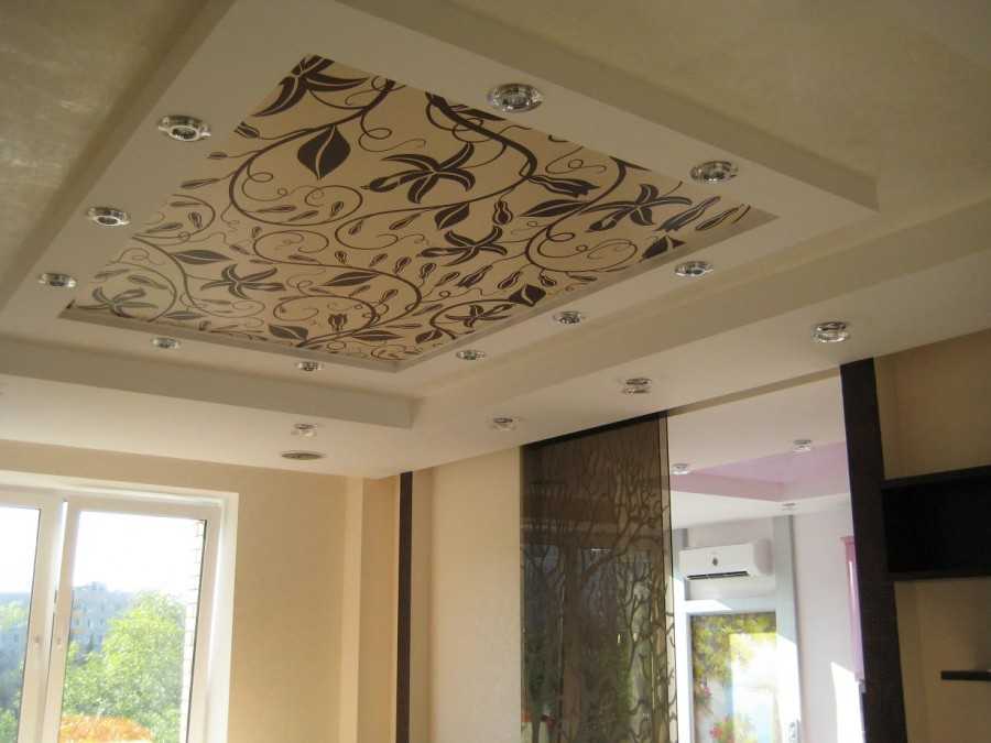 Модели потолка натяжного, выполненного из ткани, могут иметь рисунок. Это равномерно нанесенный принт или один крупный сюжет. Он может быть сосредоточен вокруг люстры либо (в случае скрытых осветительных приборов) располагаться по всей поверхности.