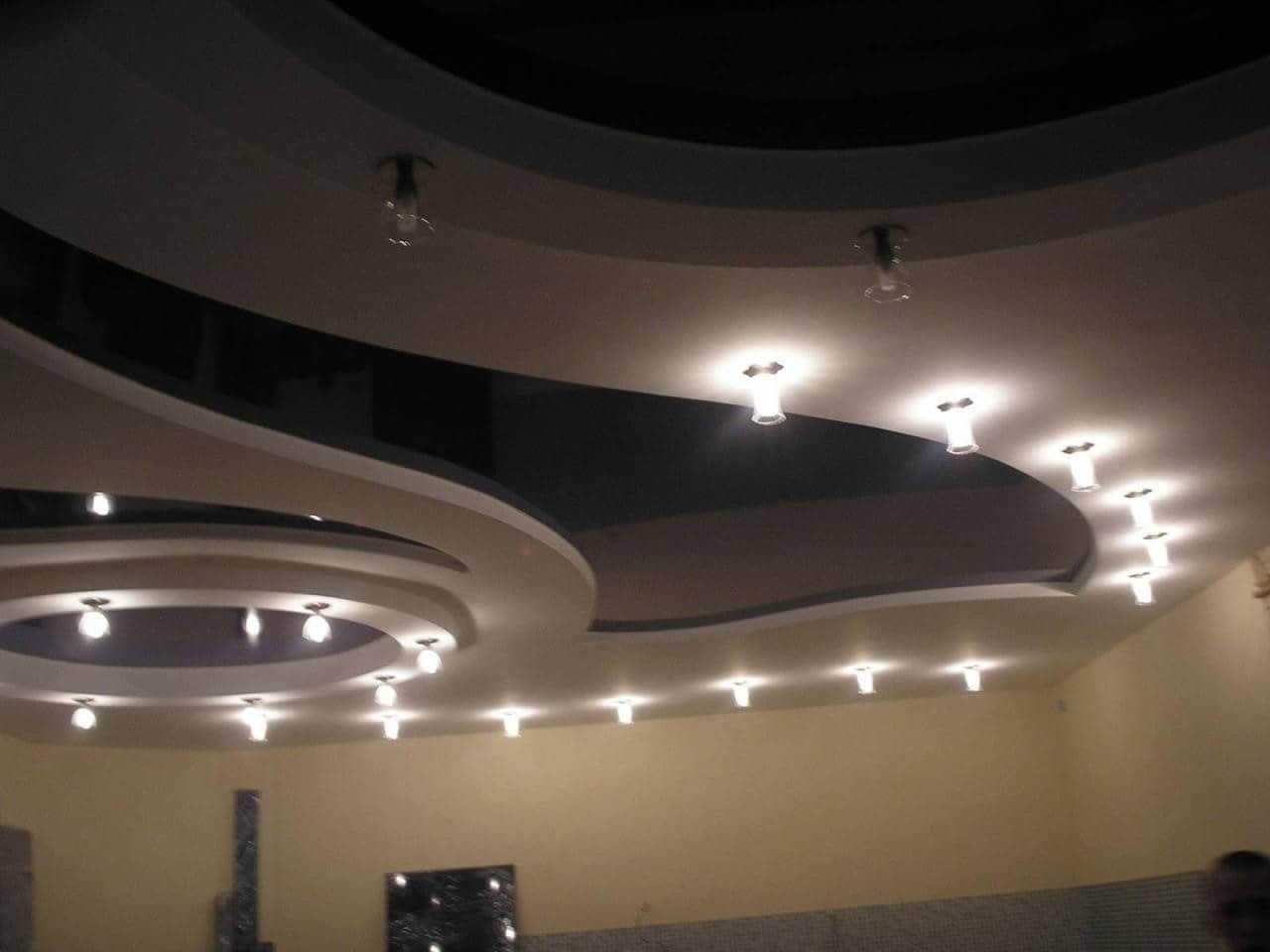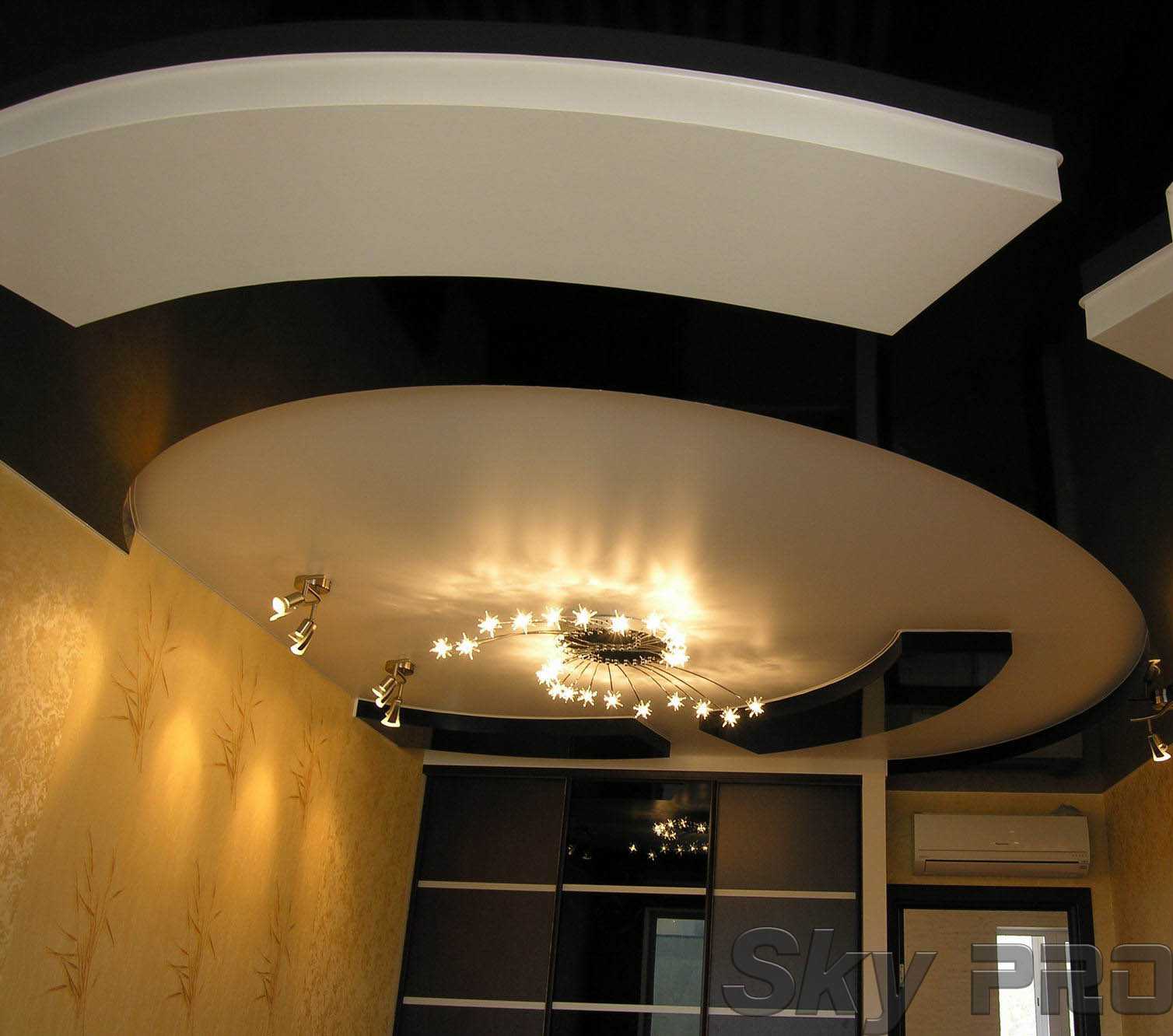 Двухуровневый потолок позволяет выполнить зонирование света и воплотить любые дизайнерские задумки