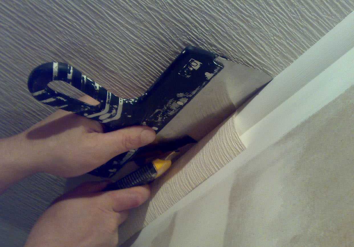 При оклейке потолка обоями учитывают одно неизменное для всех видов этого материала правило: если базовая поверхность достаточно рыхлая и неустойчивая (например, осыпающаяся известка или штукатурка), ее необходимо очистить, укрепить (зашпаклевать) и загрунтовать.
