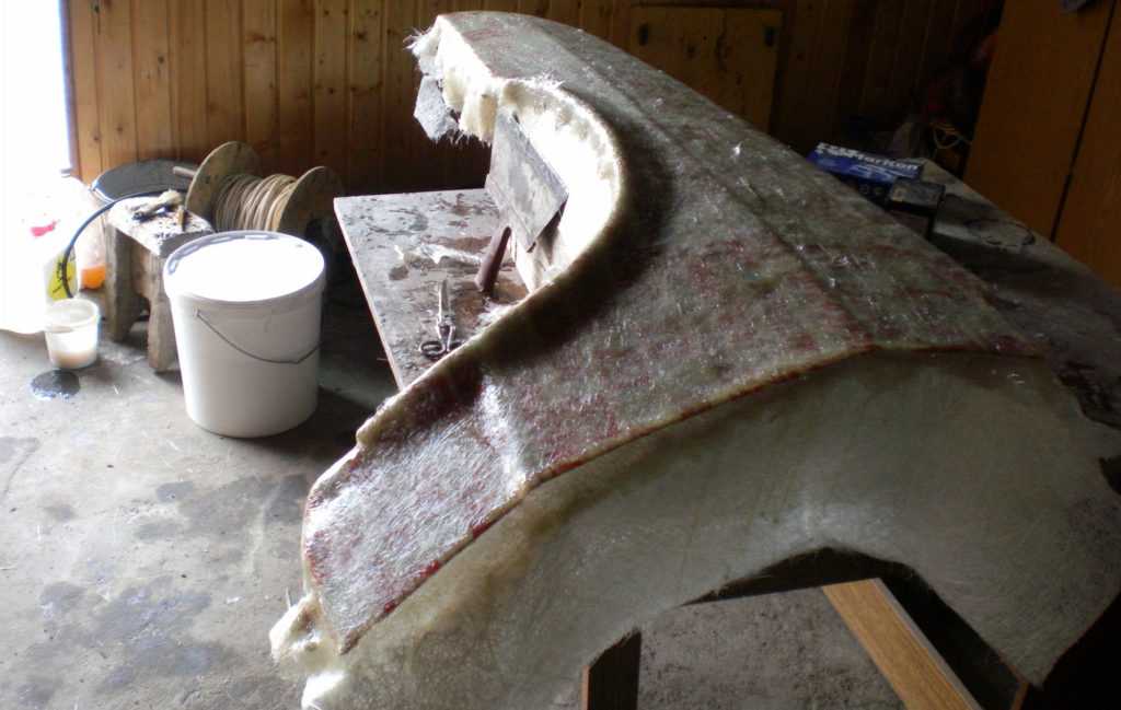 В случае откола утерянную часть восстанавливают с помощью стеклоткани. Сложность заключается в том, что надо будет с точностью повторить форму откола. Кромка откола начисто зачищается. Заплатку выравнивают с помощью наждачной бумаги. Места соединений заполняют смолой и покрывают стеклотканью, усиливая изнутри с помощью дополнительных слоёв стекловолокна. Итоговые процедуры — это полировка и покраска.