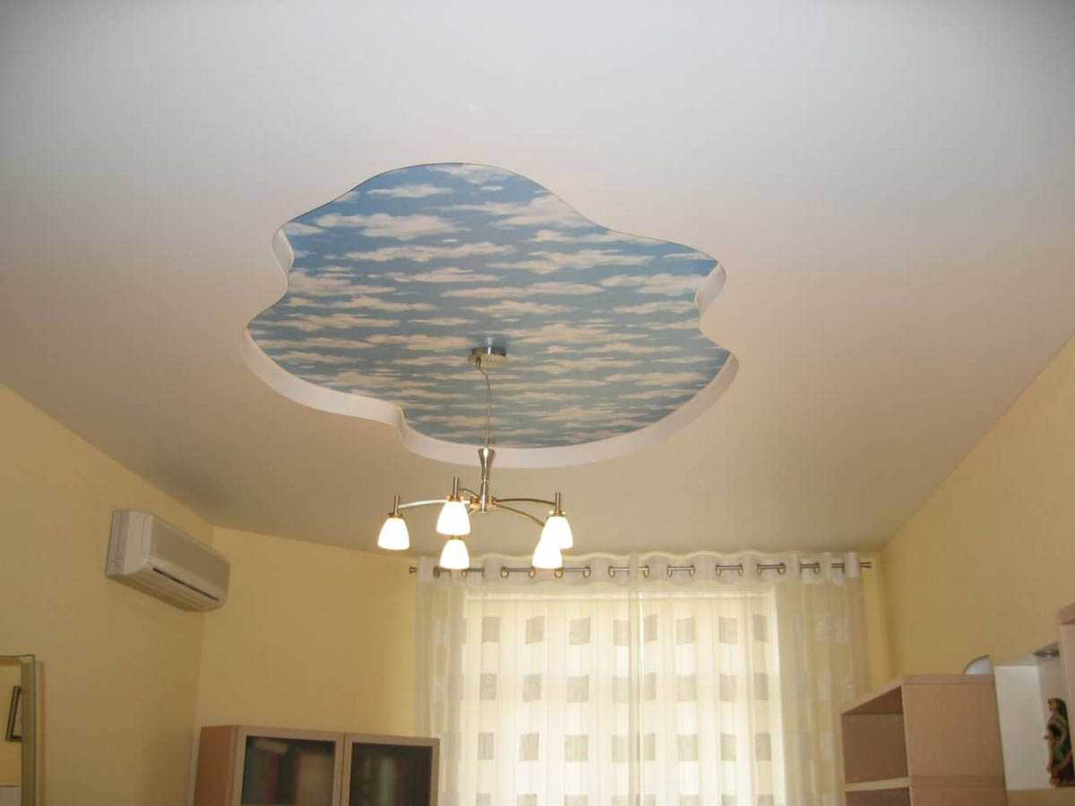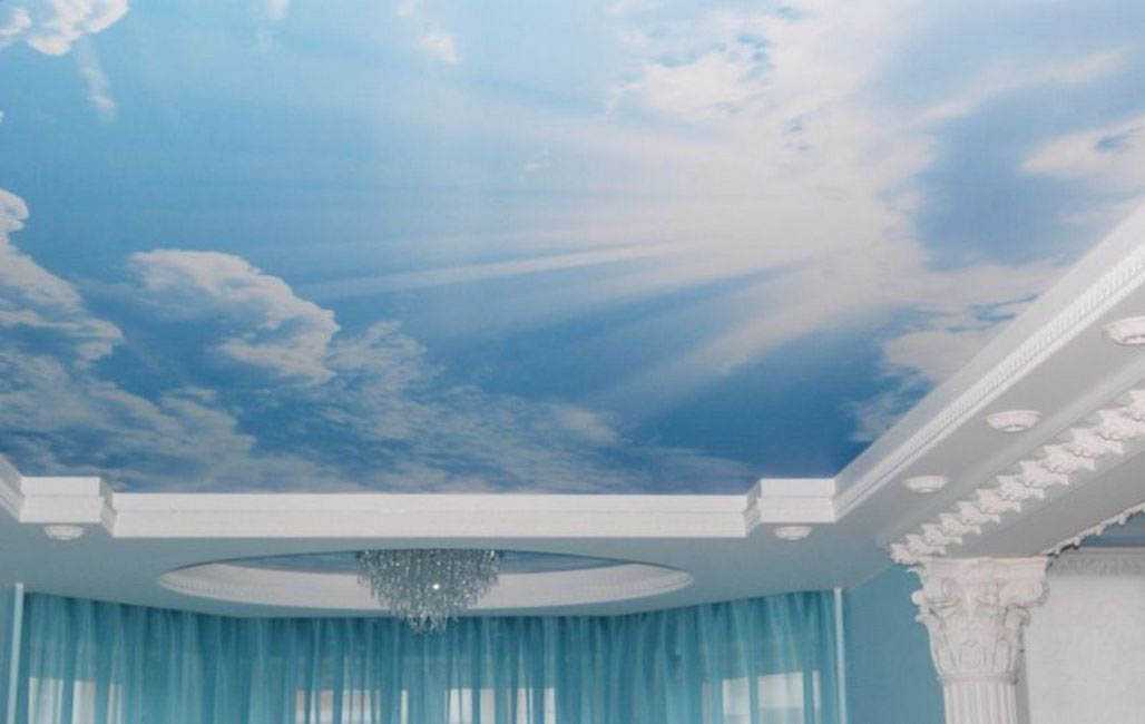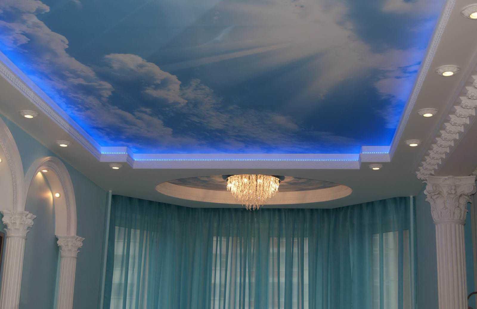 Подвесным потолком с фотопечатью можно удивить и привести в восторг всех гостей. Белые пушистые облака над головой или звездное небо являются оригинальными дизайнерскими решениями