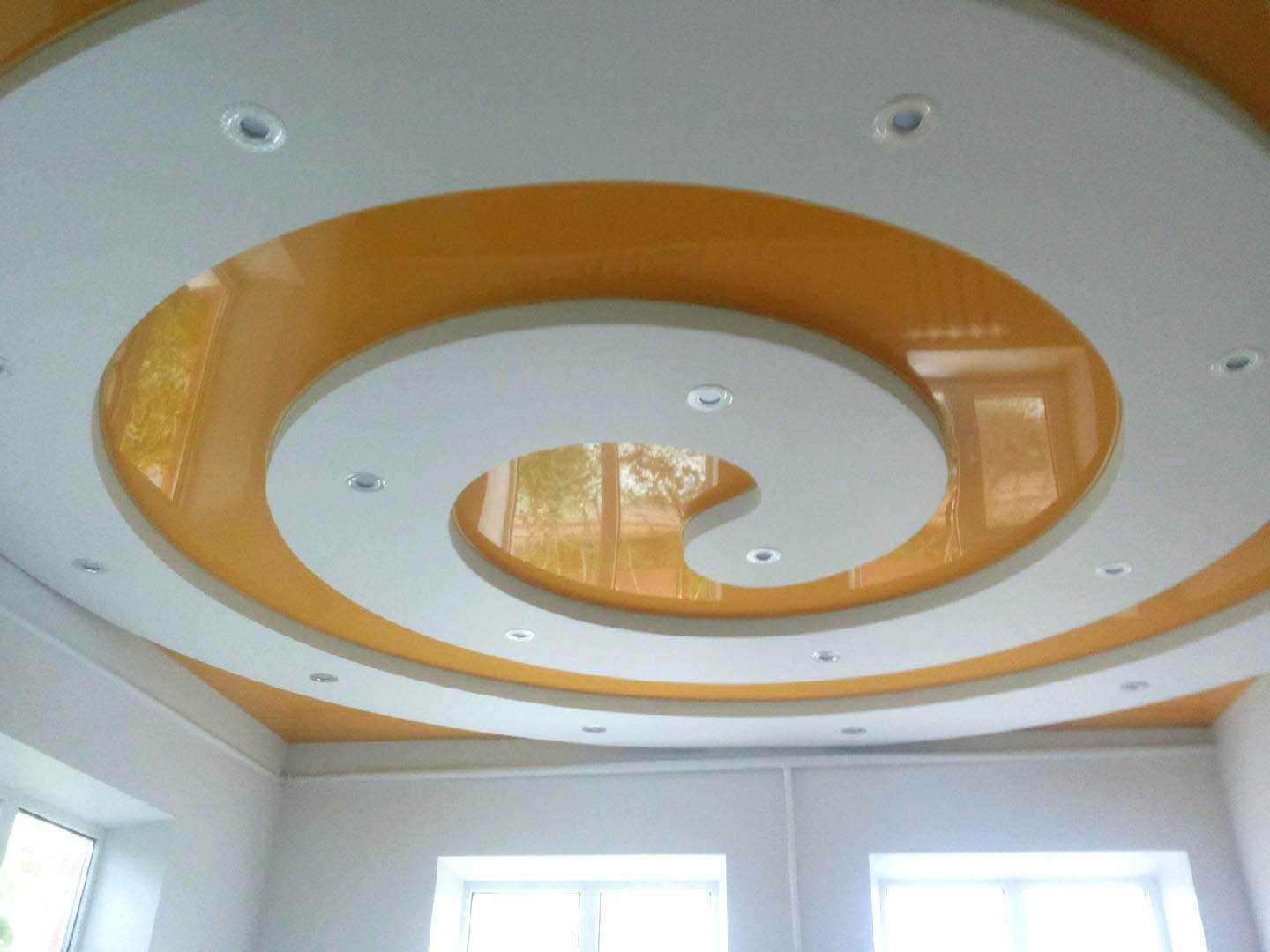 Из всех вариантов, наверное, самый сложный для реализации, но, как показывают многочисленные фото, компенсацией за изнурительное воплощение всех сложных геометрических фигур из гипсокартона на практике становится уникальная в свое роде конструкция, созданная исключительно для конкретного помещения.