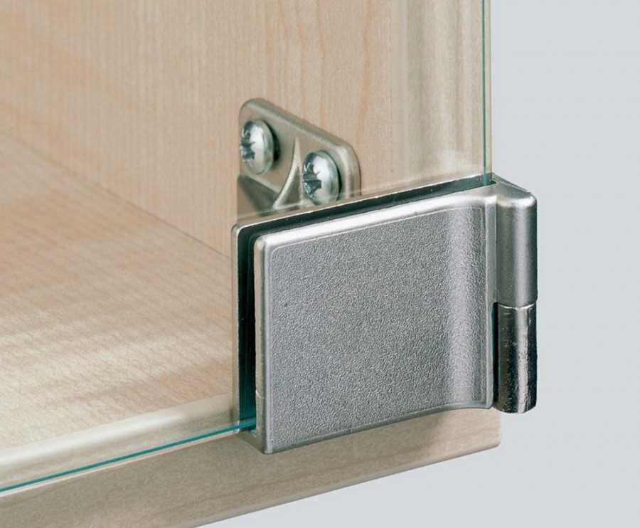- Стекло. Чтобы не повредить хрупкую поверхность, используют особые держатели с саморезом, который вкручивается в стену. Если же требуется найти фиксатор для стеклянных дверей, целесообразным будет применение мебельных петель.