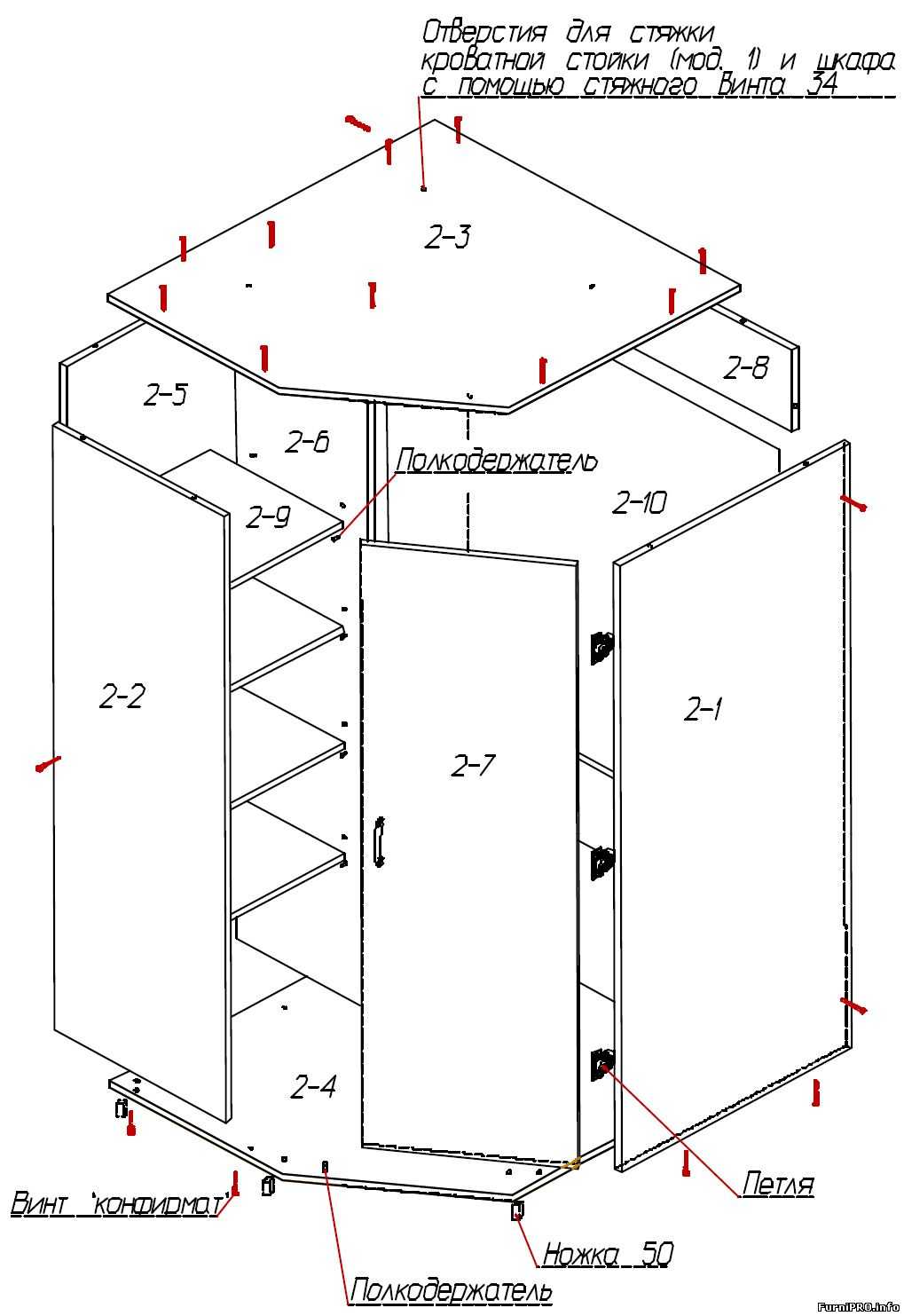 - текстовая инструкция нужна мастеру, чтобы правильно собрать изделие – к каждой единице указана спецификация и порядок сборки, а на чертеже отмечены детали конструкции и фурнитура – шаблон для сверления отверстий.