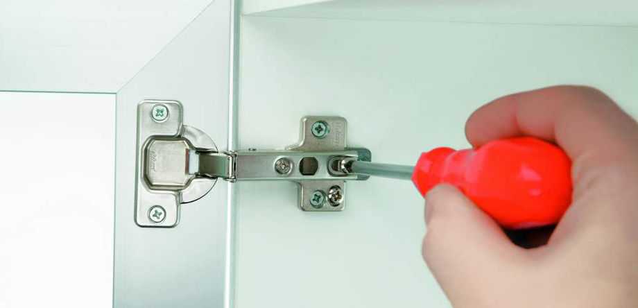 Регулировку мебельной петли начинают выполнять с корректировки вертикального положения.