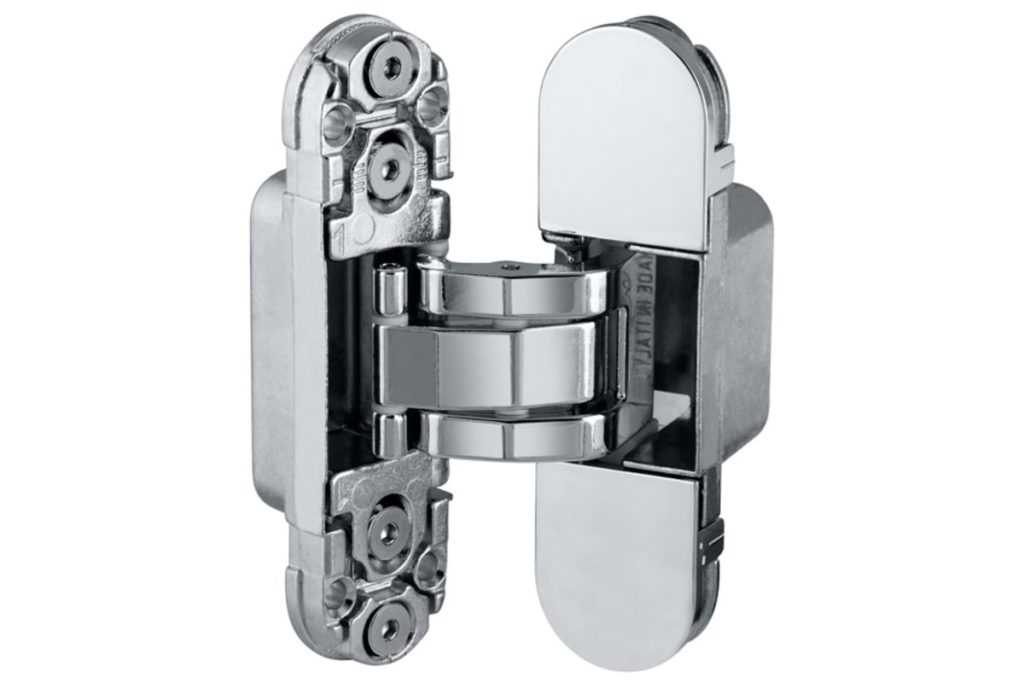 Скрытый вариант петель предназначен для тяжелых дверных конструкций. Они стоят намного дороже, чем все предыдущие виды. Оснащены специальным шарниром, который врезается в полотно.