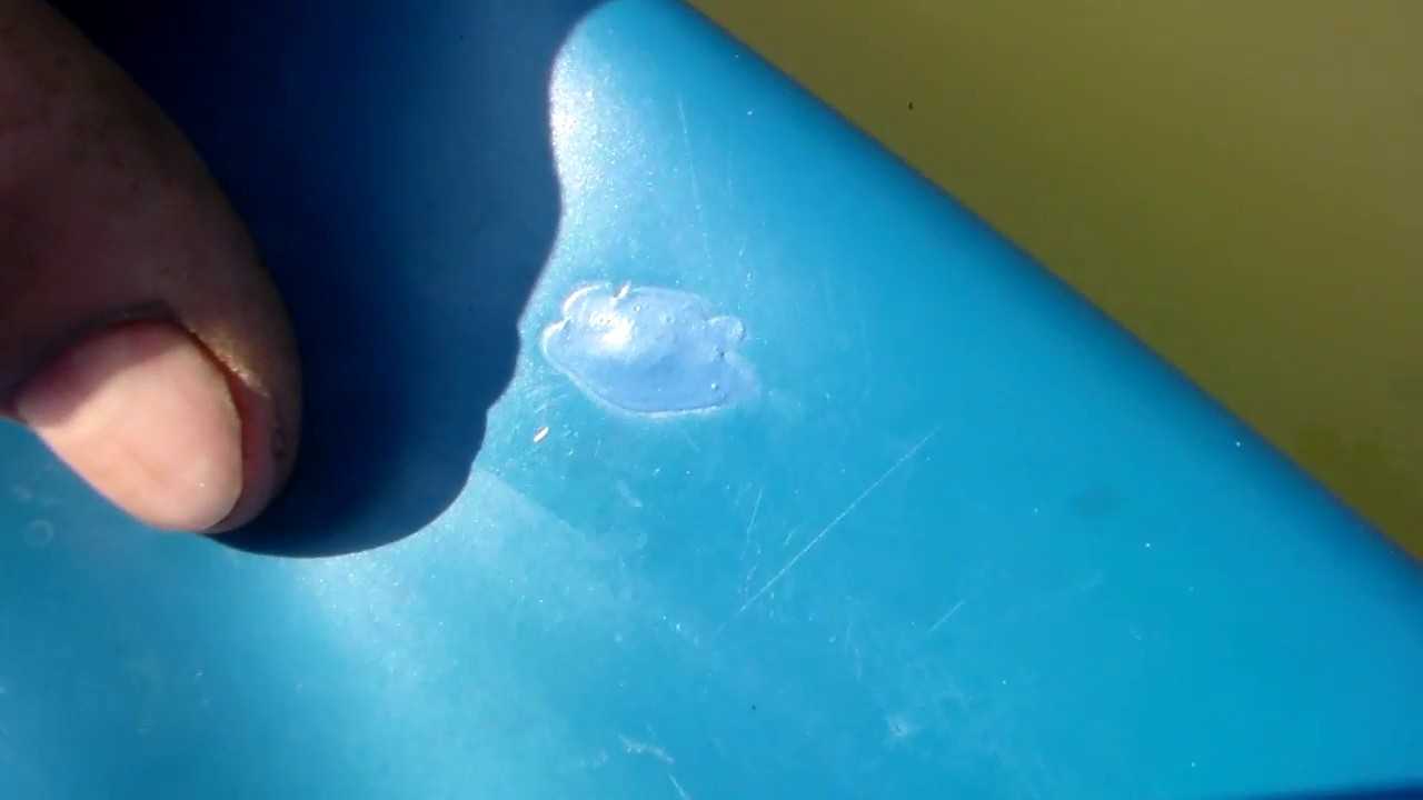 В воде скотч полностью теряет свои характеристики и липкость, поэтому перед нанесением непосредственно на повреждение, участок тщательно просушивают. Лучше всего еще и дополнительно обезжирить саму поверхность, куда будет приклеиваться скотч, поскольку обычно стенки бассейна содержат на себе следы касаний от рук.