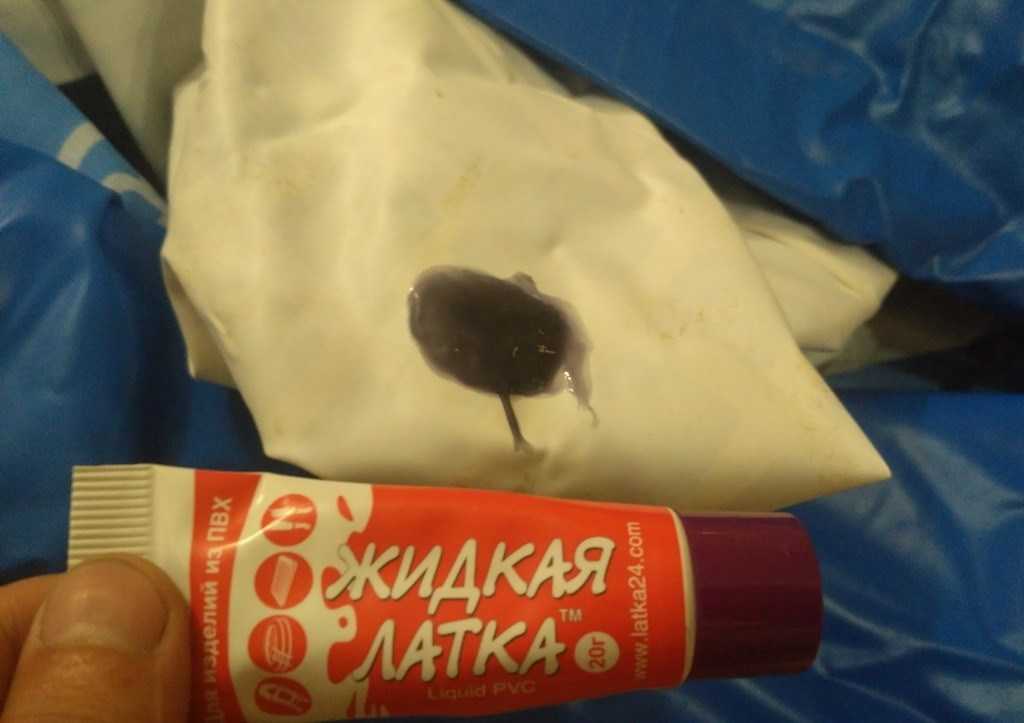 Помимо заплаток для устранения течи можно использовать специальный эластичный клей «Жидкая латка». Он состоит из ПВХ, активных реагентов и идеально подходит для ремонта лодок, тентов и бассейнов. После нанесения компоненты клея растворяют верхний слой ПВХ и, смешиваясь с ним, образуют прочное соединение.