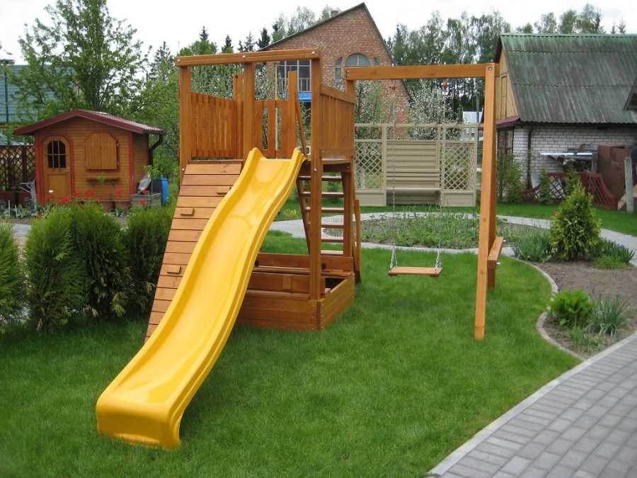 Песочницу делают, вкапывая в землю специально отобранные доски или спилы бревна. Начинают работу, снимая землю; затем основание засыпают дренирующим слоем. Горку целесообразно оснастить скатом из пластмассы, который прочнее фанерного и отличается превосходным трением. Изготовить простейшие веревочные качели можно, использовав пару стоек и довольно крепкую ветку дерева. Стойки зарывают в землю на 90 см, заполняют яму кирпичным боем, после чего заливают бетоном.