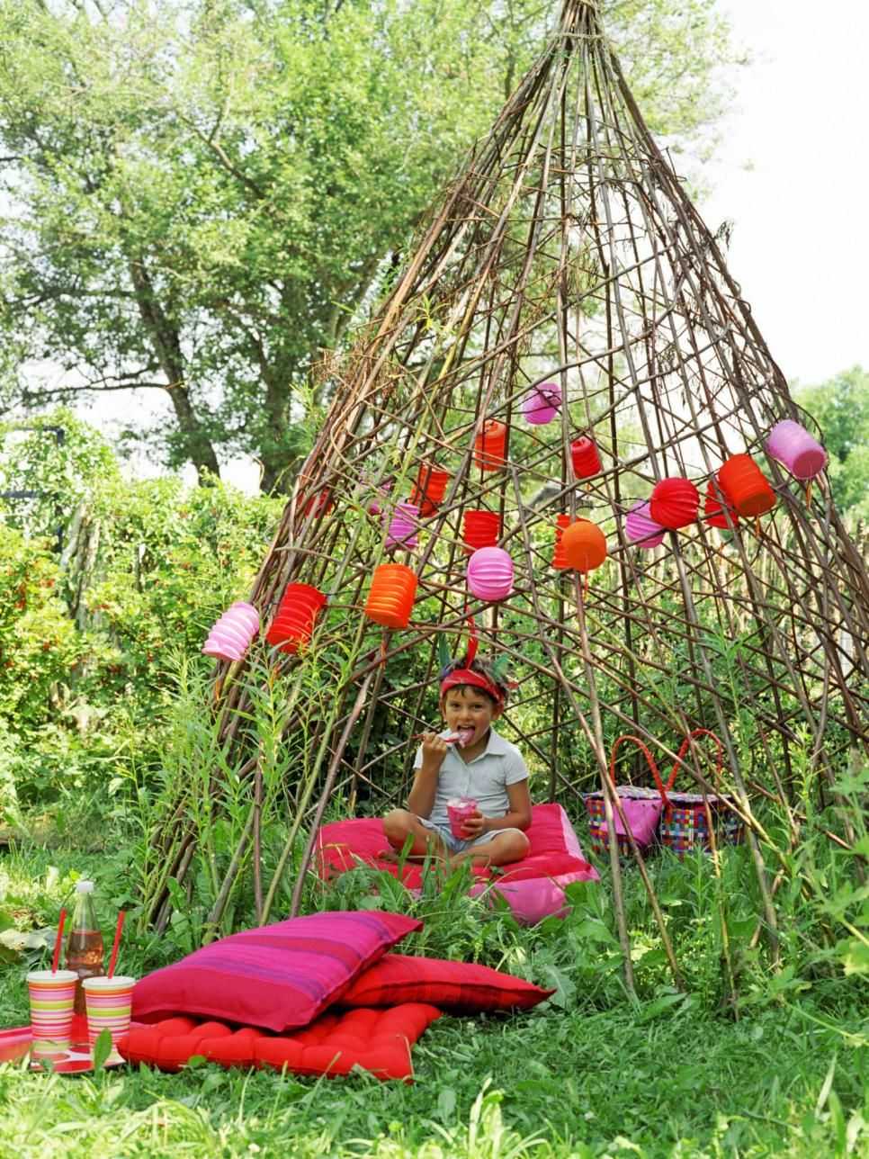 - шалаш станет местом для игр малышей и изготавливается из длинных прутьев, которые закрепляются в земле под углом. Верхние концы веток связывают. Не забудьте оставить место для входа;