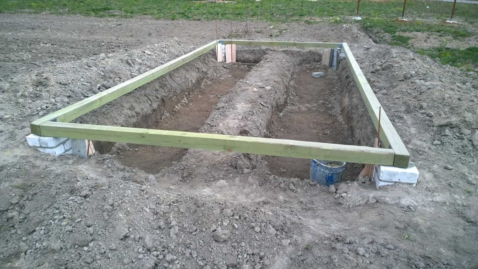 После подготовки места работы необходимо вырыть траншею. Ее размер зависит от нагрузки на фундамент. Дальше переходим к установке основание из бруса.