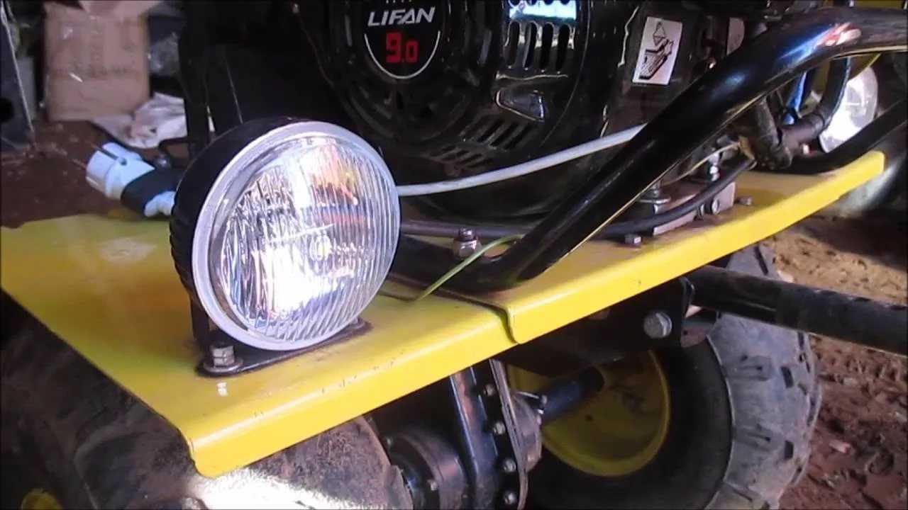 На большие мотоблоки ставят фары. Мощности генератора хватит для монтажа оборудования и функционирования приборов. Чтобы установить фары, в магазине автозапчастей можно приобрести устройство освещения или изготовить его самостоятельно.