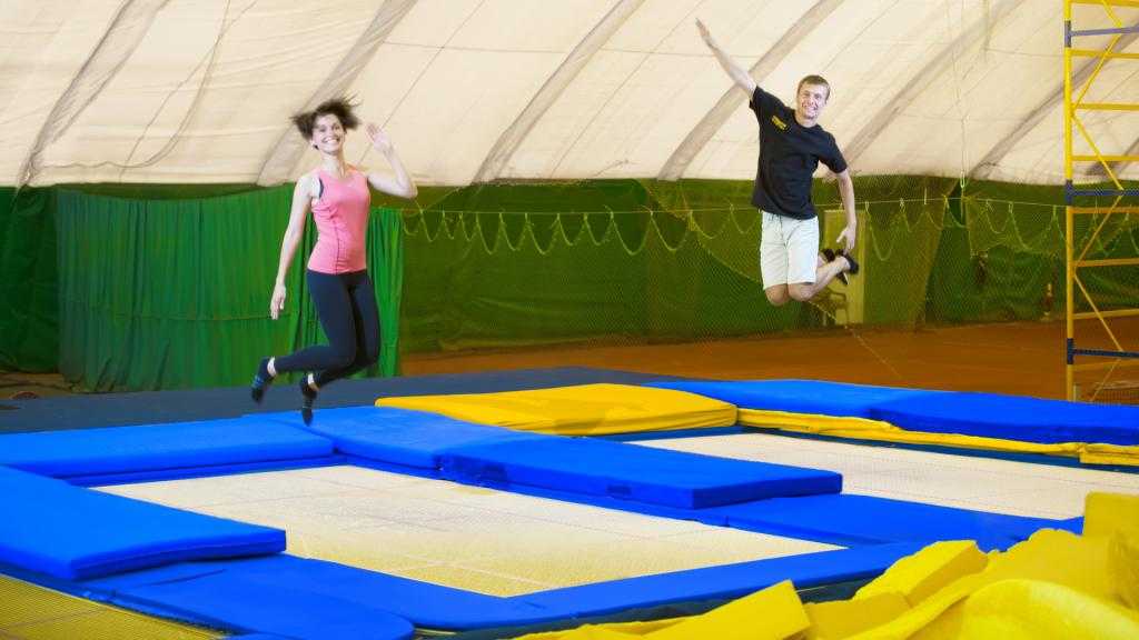 - Спортивный — используется спортсменами при подготовке к соревнованиям. Для установки этих батутов нужны специальные спортивные залы с высоким потолком, ведь он может подбросить спортсмена до десяти метров в высоту. Альтернативный вариант — установка на улице.