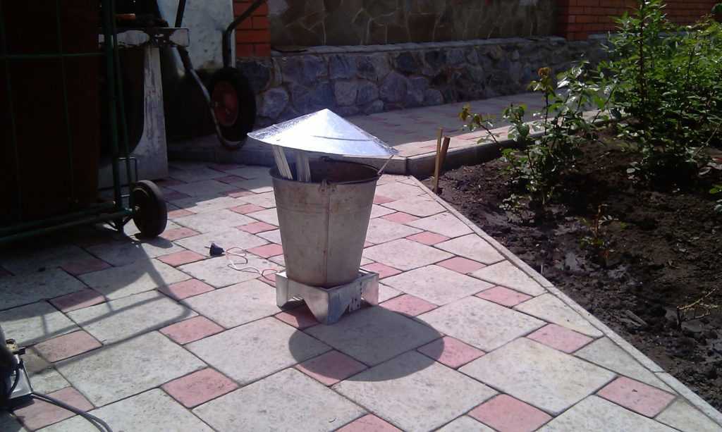 Проще всего сделать коптильню горячего копчения из конусного ведра. Такая форма облегчает установку на необходимой высоте решёток с копчёностями. Вместо поддона для жира используется старая миска, которая ставится на подставке из консервной банки. В её стенках прорезаются отверстия для выхода дыма, а сама банка переворачивается вверх дном