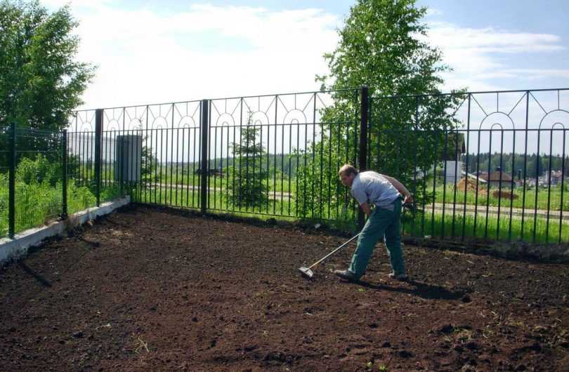 Дальше с помощью культиватора и грабель приступайте к рыхлению и выравниванию участка. У вас должна получиться абсолютно гладкая площадка. Можно воспользоваться широкой доской, протащив ее ребром по поверхности, или специальным катком. Это позволит заполнить все впадины и разгладить бугры.