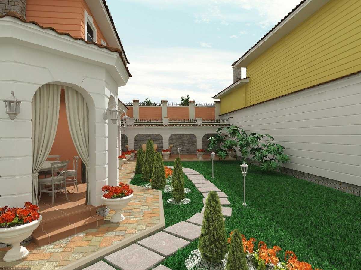 Ландшафтный дизайн предполагает применение различных цветников и клумб. Для закрытого двора неплохое решение вазоны. В них можно поселить экзотические культуры, например, кипарис, гранат или лимон.