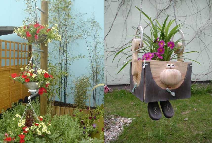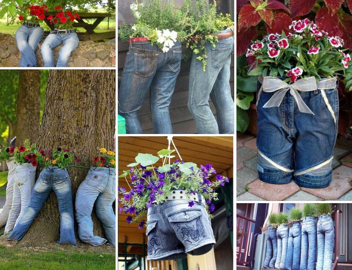 Из одежды. Интересные вариации получают, наполнив песком, грунтом или мелким гравием поношенные джинсы. Из получившихся конструкций формируют необычные вазоны, помещая внутрь горшки с цветущими растениями.