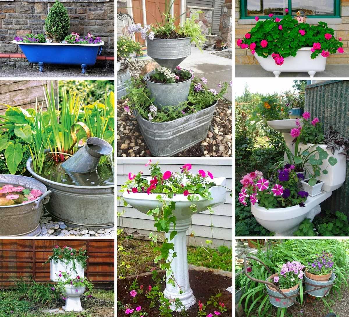 Из старой сантехники. Старая ванна, раковина и даже унитаз послужат необычным ограждением для цветущих растений на участке. Их наполняют питательным рыхлым грунтом и помещают сеянцы.