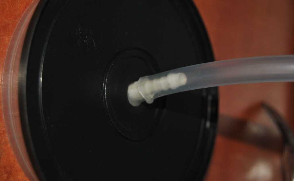 Сделайте в крышке отверстие и вставьте в него переходник для шланга. Этот переходник желательно обработать силиконовым клеем, чтобы сделать его более герметичным. Данная конструкция обеспечит водой большую площадь вашего сада и/или огорода.